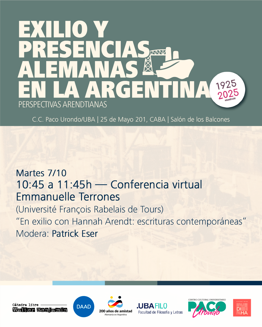 En el 50º aniversario de la muerte de Hannah Arendt, su pensamiento ofrece herramientas conceptuales indispensables para examinar el exilio y las dinámicas migratorias. La fenomenología arendtiana del desarraigo -la pérdida del mundo común, la exclusión de la esfera política, la ruptura con lo cotidiano- revela una impresionante lucidez para analizar el horror del exterminio nazi y sus consecuencias duraderas. Sus tempranos textos sobre el exilio invitan a explorar los modos concretos en que la vida en la ‘segunda patria’ se convierte en territorio de resistencia, trauma y reconfiguración de la memoria. Queremos dar visibilidad especialmente a las trayectorias vitales de los miles de judío-alemanes que se establecieron en la Argentina y a las dinámicas culturales que de ellos emergieron. Partiendo de inspiraciones de Arendt y de otros pensadores del desarraigo, proponemos explorar, a partir de un formato interdisciplinario, las experiencias y consecuencias de los movimientos, exilios y las emigraciones, en un evento que constará de mesas y conversatorios que van desde la reflexión filosófico-político-cultural hasta la investigación historiográfica, desde la conversación sobre experiencias autobiográficas y familiares hasta la intervención artística (teatro, cine y literatura).