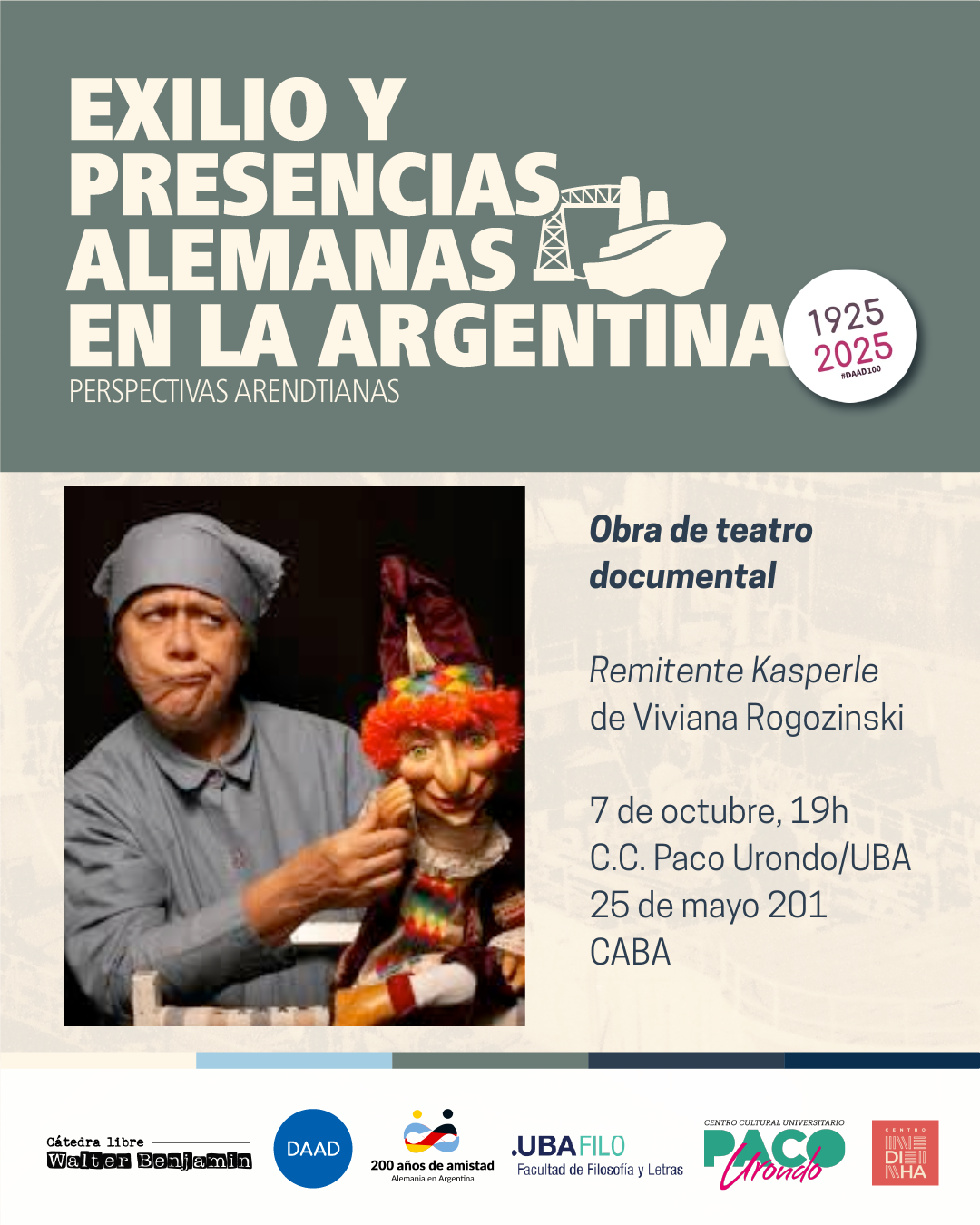 Las Jornadas EXILIO Y PRESENCIAS ALEMANAS EN ARGENTINA. Mundos, legados, saberes en disputa incluyen un programa cultural que abarca proyecciones cinematográficas, lecturas literarias y una obra de teatro documental que acompañarán la parte académica para crear un diálogo vivo entre pensamiento y creación. El proyecto forma parte del proyecto 200 años de la inmigración alemana a la Argentina de la Embajada alemana.